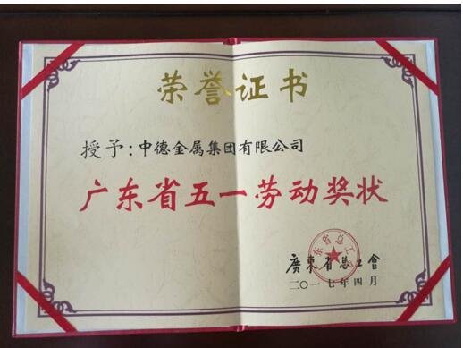 中德金屬集團“廣東省五一勞動獎狀”榮譽證書