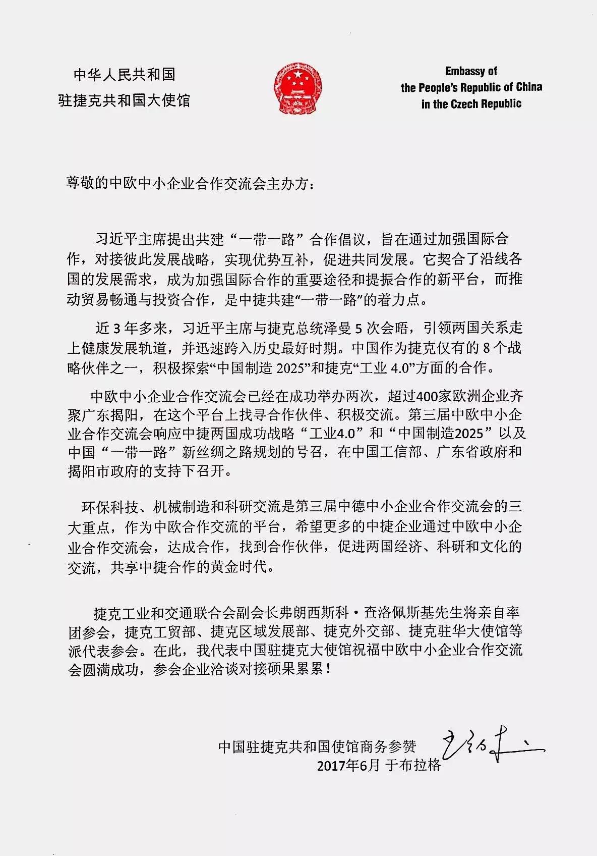 中國駐捷克共和國大使館發(fā)來賀電,祝福交流會圓滿成功,參會企業(yè)洽談對接碩果累累!