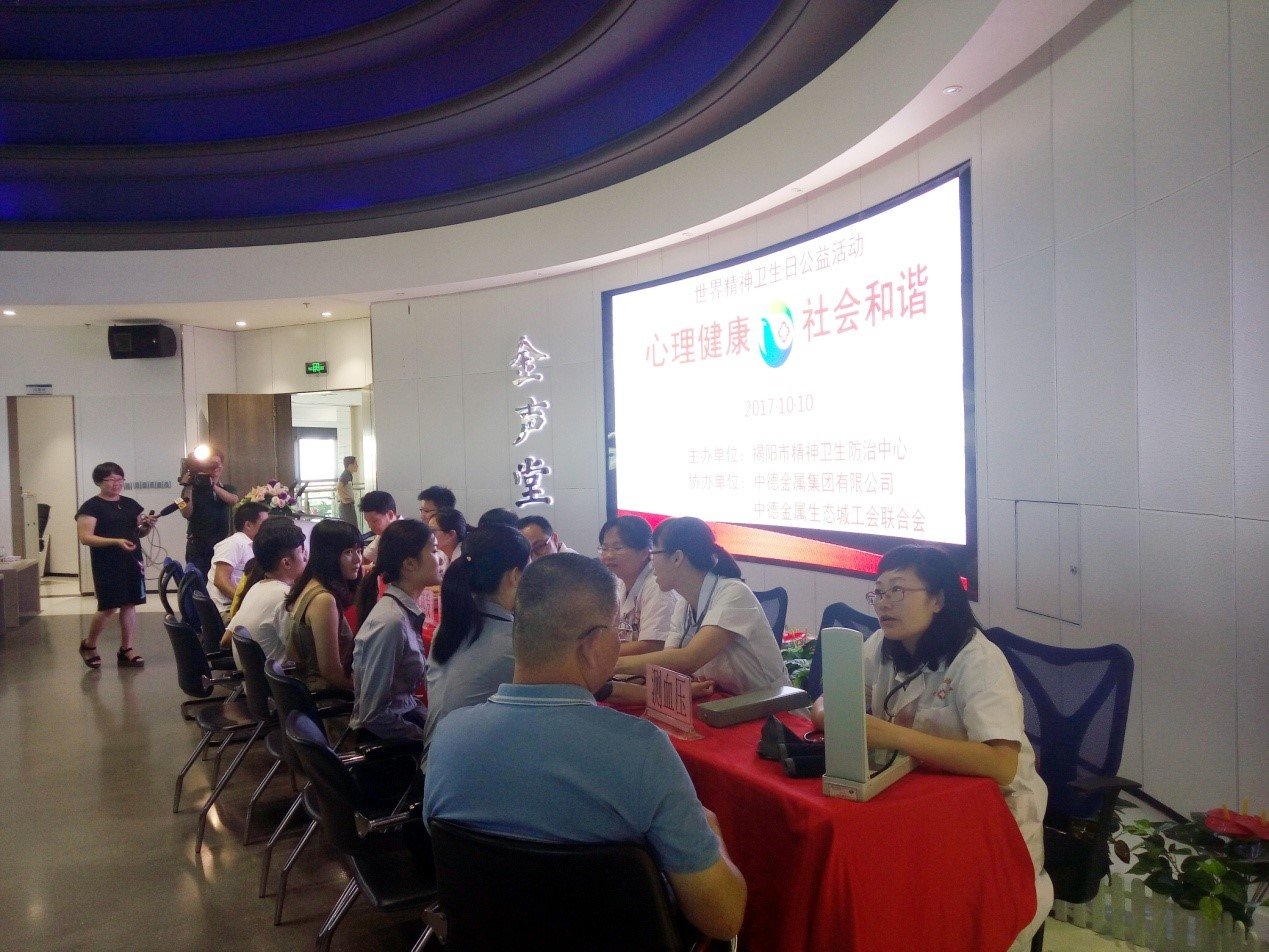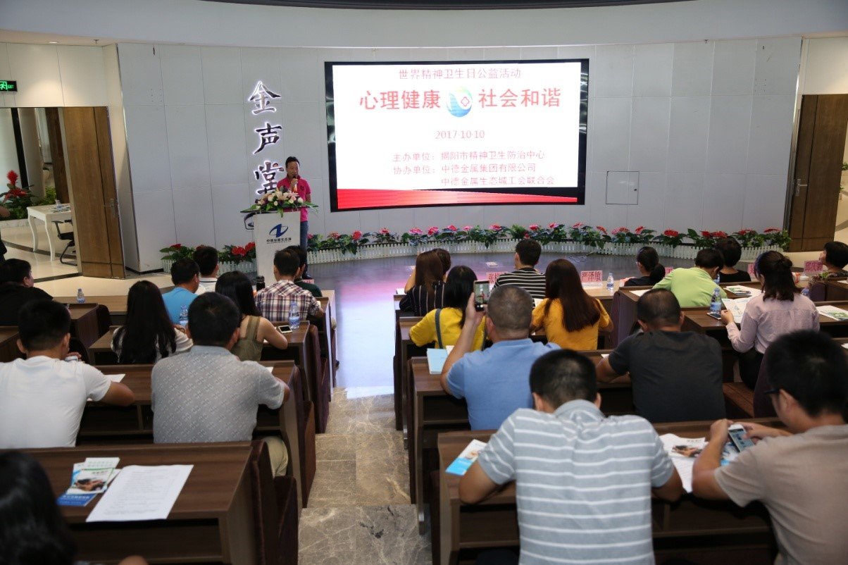 為引起社會(huì)對(duì)精神衛(wèi)生問題的關(guān)注,讓職工對(duì)慢性病防治知識(shí)有所了解,提高職工的健康水平,10月10日上午,由揭陽市慢性病防治院主辦,中德金屬集團(tuán)有限公司及中德金屬生態(tài)城工會(huì)聯(lián)合會(huì)協(xié)辦的“心理健康•社會(huì)和諧”健康講座在中德金屬生態(tài)城四大中心金聲堂舉行。市慢性病防治院院長張梓揚(yáng)等參加活動(dòng)。來自中德金屬集團(tuán)辦公室、房產(chǎn)營銷部、項(xiàng)目管理部、信息技術(shù)部及表處園、建筑公司、物業(yè)公司、研究院等集團(tuán)子公司80多人到場聆聽。