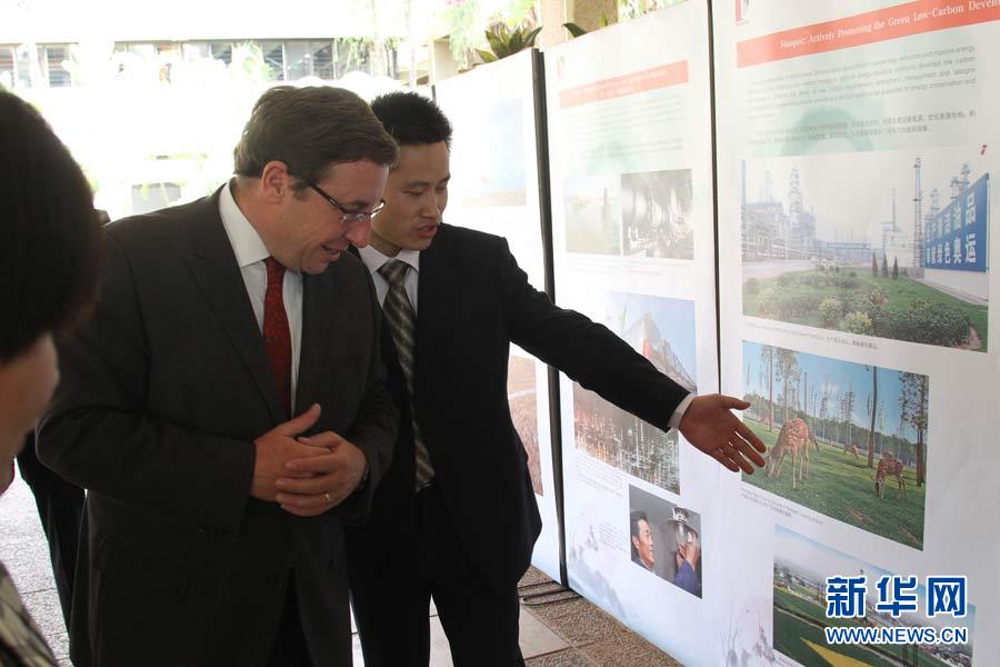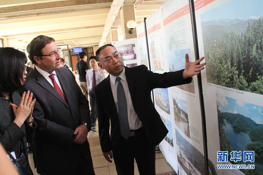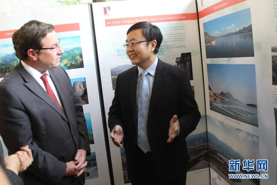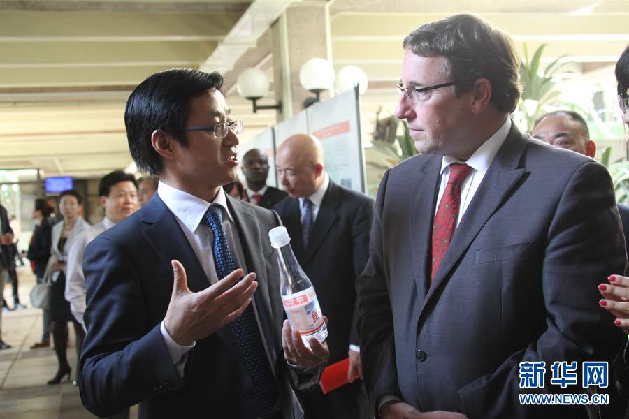 廣東省揭陽(yáng)市副市長(zhǎng)陳澄民(左)向聯(lián)合國(guó)副秘書長(zhǎng)施泰納介紹揭陽(yáng)市環(huán)保圖片。5月20日,“明月行動(dòng).綠色中國(guó)夢(mèng)”大型環(huán)保公益活動(dòng)中國(guó)環(huán)保圖片展在肯尼亞首都內(nèi)羅畢聯(lián)合國(guó)環(huán)境規(guī)劃署新華影廊舉行,展示中國(guó)地方政府和大型國(guó)資企業(yè)與知名企業(yè)關(guān)注環(huán)保、力行環(huán)保、堅(jiān)持環(huán)保的上百?gòu)垐D片,廣東省揭陽(yáng)市政府、中國(guó)石化集團(tuán)、西安浐灞生態(tài)區(qū)和加多寶集團(tuán)昆侖山礦泉水公司等代表在展覽中向聯(lián)合國(guó)官員及來(lái)賓介紹生態(tài)環(huán)保成就。汪勇基攝