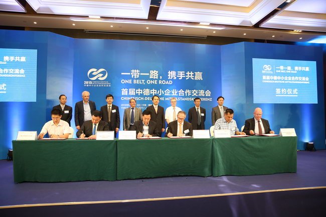 首屆中德中小企業(yè)合作交流會(huì)取得豐碩成果。圖為6日下午的合作項(xiàng)目簽約場面。