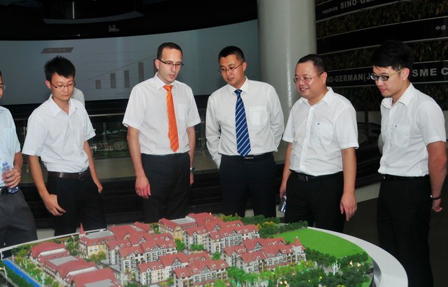 韋寶良(右二)一行參觀(guān)中德金屬生態(tài)城營(yíng)銷(xiāo)展廳,了解項(xiàng)目發(fā)展歷程及與德合作情況