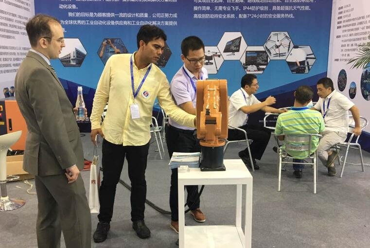 加德偉公司的智能機(jī)械臂引起境外采購商的注意。圖為公司參展負(fù)責(zé)人現(xiàn)場展示產(chǎn)品功能